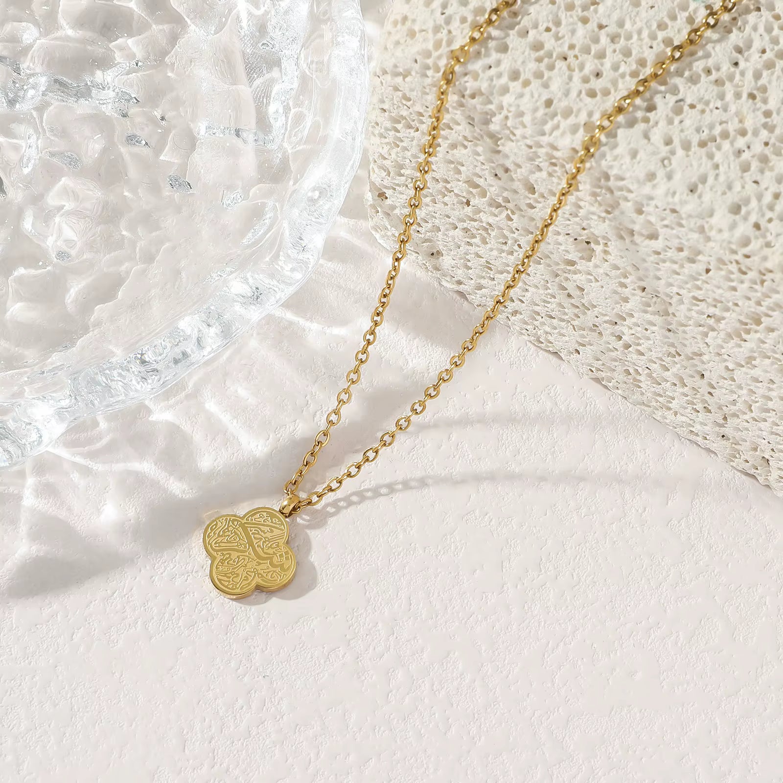 This refined pendant showcases a graceful clover design highlighted by the Arabic letters for Shukar.